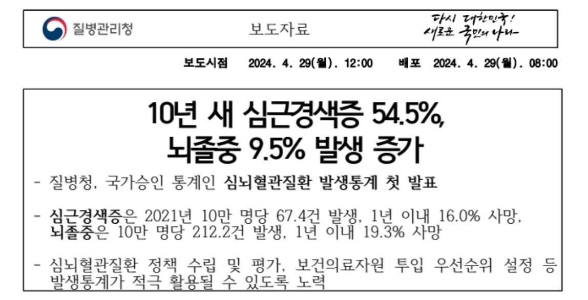 요즘 심근경색, 뇌경색 환자가 증가하는 중요한 이유 중 하나는 고혈압 치료를 약에 너무 의존하기 때문이다. 약으로 혈압을 강제로 낮추면 혈관이 터질 가능성은 줄어들지만, 혈관이 막힐 가능성은 더 커진다. 뇌졸중 환자 중 뇌혈관이 막히는 뇌경색이 전체의 80%, 뇌혈관이 터져서 발생하는 뇌출혈이 20%를 차지한다 [29]. 지난 10년간 뇌졸중은 9.5% 증가, 심근경색은 54.5% 나 증가했다(아래자료) [30].