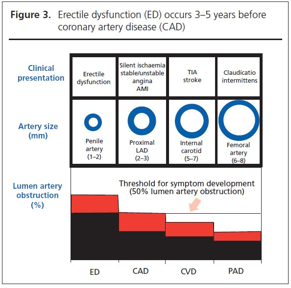 남성에게 흔한 발기부전(Erectile dysfunction)은 심혈관질환 '탄광의 카나리아' 역할을 한다. 페니스 동맥 직경은 1-2mm인 반면 심장 동맥은 3-4mm 정도이다. 일반적으로 동맥 직경의 50% 이상이 막히면 증상이 나타나기 시작하므로, 직경이 작은 동맥을 가진 페니스부터 증상이 나타난다 (아래도표) [15,16].