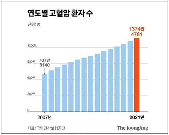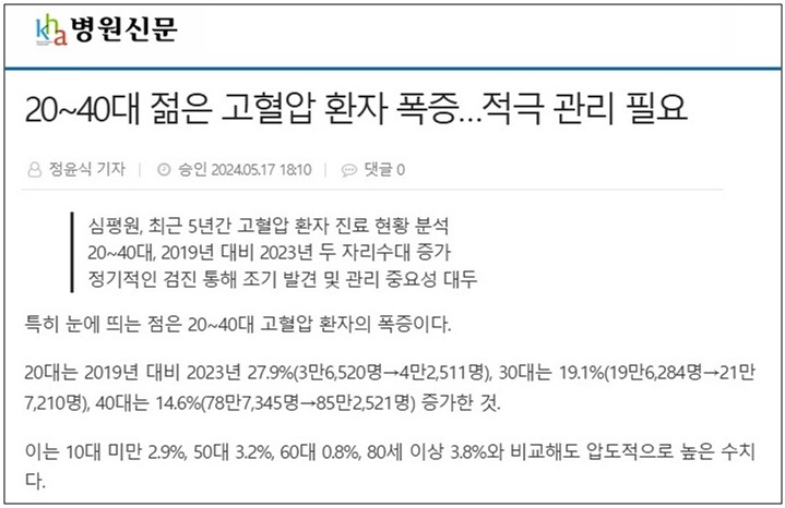 최근에는 젊은 고혈압 환자가 급증하고 있어 심각한 사회문제라 아니할 수 없다(아래기사) [12].