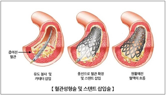 응급실로 온 심근경색 환자의 심장 혈관이 좁아진 것이 확인되면, 좁아진 관상동맥 부위에 금속으로 된 얇은 그물망인 직경 2mm 정도의 '스텐트'를 넣어 좁아진 혈관을 넓혀주는 경피적관상동맥중재술(PCI, Percutaneous Coronary Intervention)을 한다 (아래그림) [32].