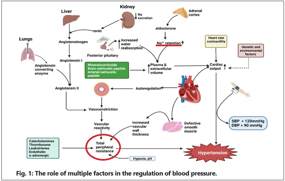 소금 섭취와 고혈압의 관계는 비교적 잘 알려져 있어, 흔히들 음식 "짜게 먹지 말라"는 말로 대중들이 잘 알고 있다. 소금을 많이 섭취하면 혈액 내 체액량이 증가하여 혈압이 상승한다 [4,5].