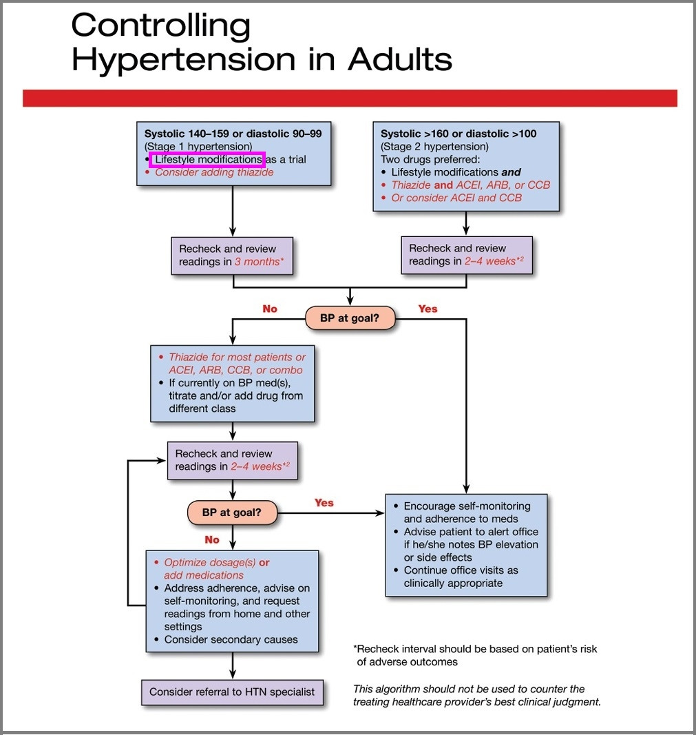 미국 심장학회의 고혈압 치료 가이드라인에는 160/100mmHg 이하의 1기 고혈압에는 생활습관 교정을 우선적으로 권하고 있다 (아래도표) [23].
