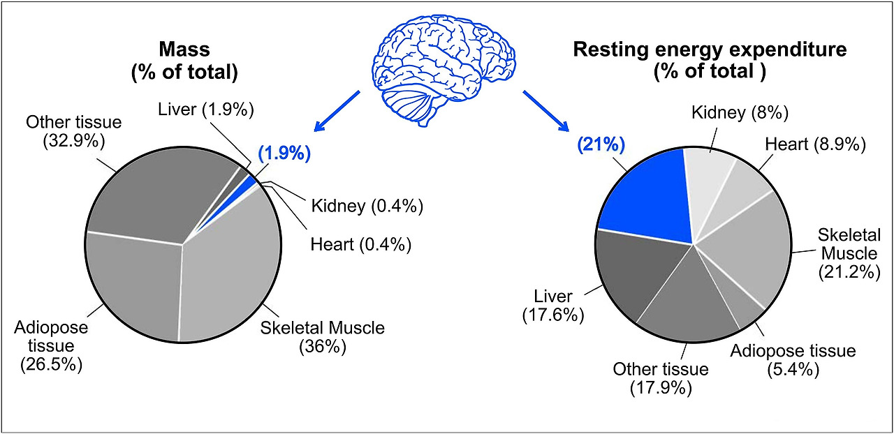 뇌는 우리 몸에서 에너지 소모가 가장 많은 기관이다. 뇌는 무게로 신체의 2%에 불과하지만 신체 에너지의 20%를 사용한다 (아래그림) [43].