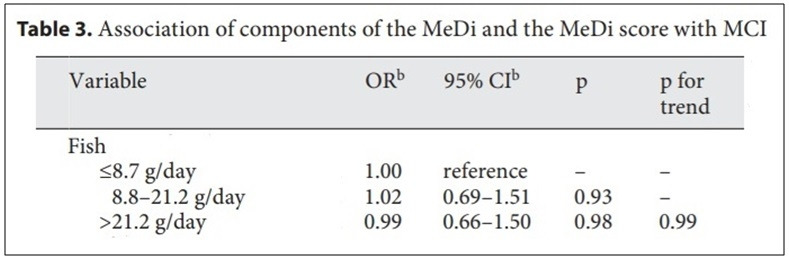 미국 메이요 클리닉 연구에 의하면, 지중해식 식단 중 생선은 치매 예방에 별 도움이 안되었다(*아래도표 설명 -> p-값이 0.05보다 작으면 "통계학적으로 유의미하다" 또는"두 집단 간에 차이가 있다"는 의미지만, 생선의 경우 p-값이 1에 가까이 나오므로 생선을 많이 먹으나, 적게 먹으나 치매 예방에는 아무런 차이가 없었다) [54].