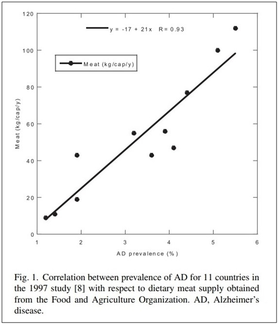 최근(2023년) 알츠하이머병 저널에 발표된 광범위한 연구에 의하면, 치매를 일으키는 가장 큰 요인은 고기였고, 고기 섭취량과 치매 발병은 정비례하여 증가했다(아래그래프) [47].