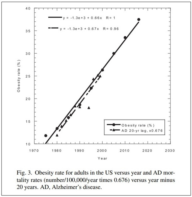 비만율과 치매로 인한 사망률은 정비례하여 증가한다 (아래그래프).