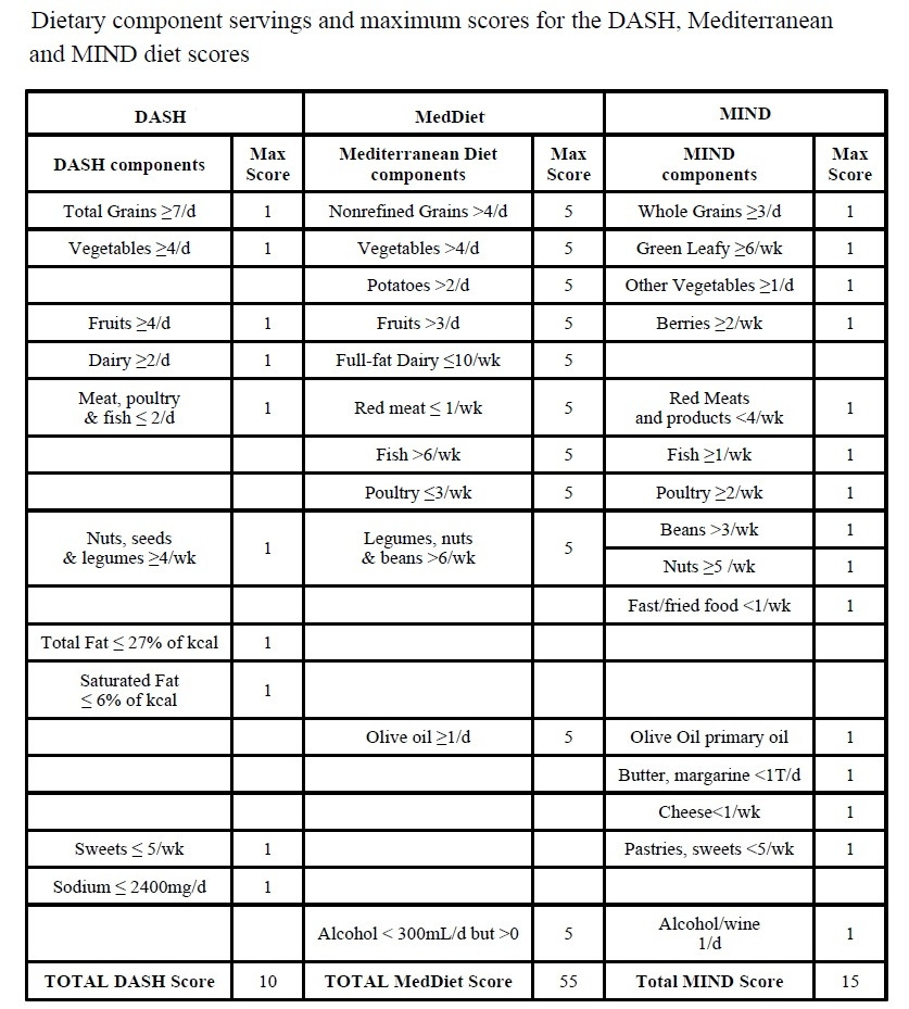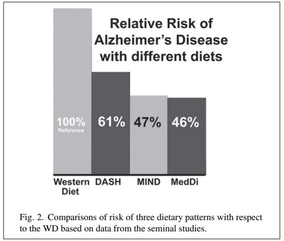 미국 시카고 러시(Rush) 대학의 모리스(Morris) 박사팀은 지중해식 식단과 고혈압 치료를 위한 DASH(Dietary Approaches to Stop Hypertension) 식단의 장점을 결합하여 치매, 특히 AD 예방을 목적으로 MIND(Mediterranean-DASH Intervention for Neurodegenerative Delay)라는 식단을 개발하여 2015년 발표했다. 고기와 포화지방이 많은 음식을 제한하고, 베리류의 과일과 푸른잎 채소 섭취를 강조하는 이 식단을 엄격하게 따르면 치매 발생률이 최대 53% 감소, 느슨하게 따르더라도 약 35% 감소하였고, 인지 기능 저하 속도를 7.5년 지연시키는 효과가 있었다 [52].