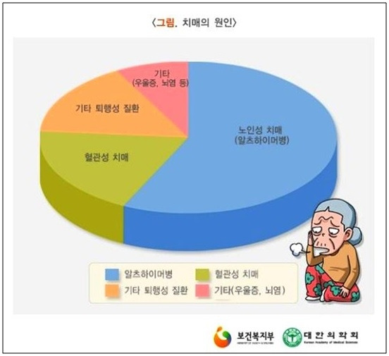 치매에는 몇가지 원인이 있다. 그중 신경 퇴행성 질환인 알츠하이머 병이 약 70%, 중풍 후유증으로 생기는 혈관성 치매가 약 25%, 그 외 파킨슨병 등 기타 원인 치매가 약 5%를 차지한다 [6].
