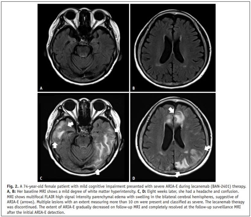 세가지 약들은 모두 뇌 속의 아밀로이드를 제거하는 작용을 하기에, 심각한 부작용인 'ARIA' 가 20-30%의 환자에서 나타난다(*아래 뇌 MRI 사진 설명 -> 74세 여성으로 레카네맙 투여 2달 후 '뇌부종'으로 인한 두통 및 정신착란 상태 발생, 투약 중단 함) [22].