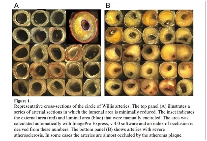 위 사진은 뇌 기저면의 동맥혈관을 부검한 사진이다. 정상인의 뇌동맥들은(A) 직경이 넓고 시원하게 뚫려있어 피가 잘 흐르게 되어있지만, 치매 환자의 뇌동맥들은(B) 콜레스테롤과 지방의 침착으로 인한 '죽상동맥경화증'으로 직경이 좁아져있고, 심지어는 막히기 일보 직전이라 피가 제대로 흐를 수가 없다 [34].