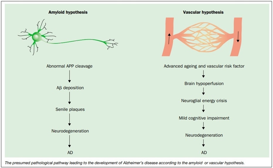 전통적으로 알츠하이머 병의 원인으로는 두가지 학설이 있었다. 아밀로이드(amyloid)라는 독성이 있는 작은 단백질이 뇌에 침착하여 뇌세포를 손상시킨다는 ‘아밀로이드 가설’과 뇌로 가는 혈액순환의 장애로 충분한 혈액 공급이 안되어 뇌세포가 손상된다는 ‘혈액순환 가설’이다(아래그림) [8].