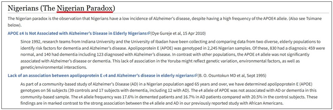 117. O Gureje, A Ogunniyi, O Baiyewu, et al. APOE epsilon4 is not associated with Alzheimer's disease in elderly Nigerians. Ann Neurol 2006;59(1):182-5.