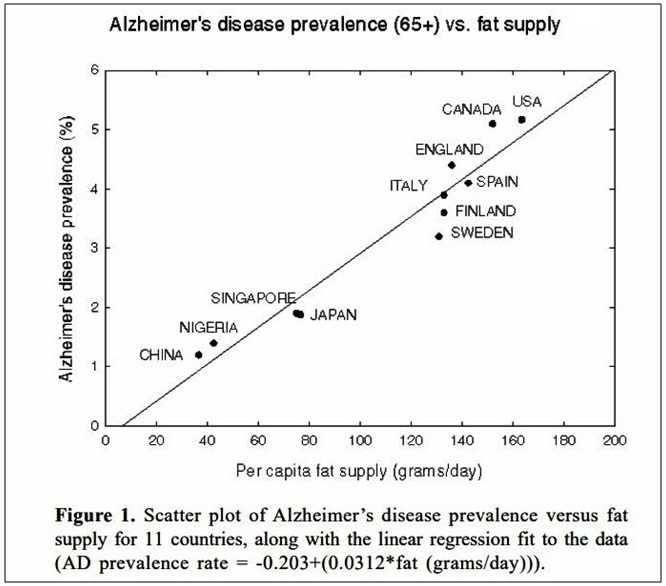 11개국 치매 빈도와 음식섭취 패턴을 조사한 결과, 지방 섭취가 많을수록 치매 빈도는 증가했다. 지방섭취가 적은 중국이나 나이지리아에 비해 지방섭취가 많은 미국이나 캐나다의 치매 빈도는 가장 높았다 (아래도표) [44].