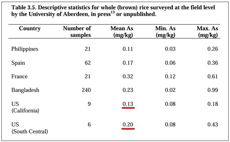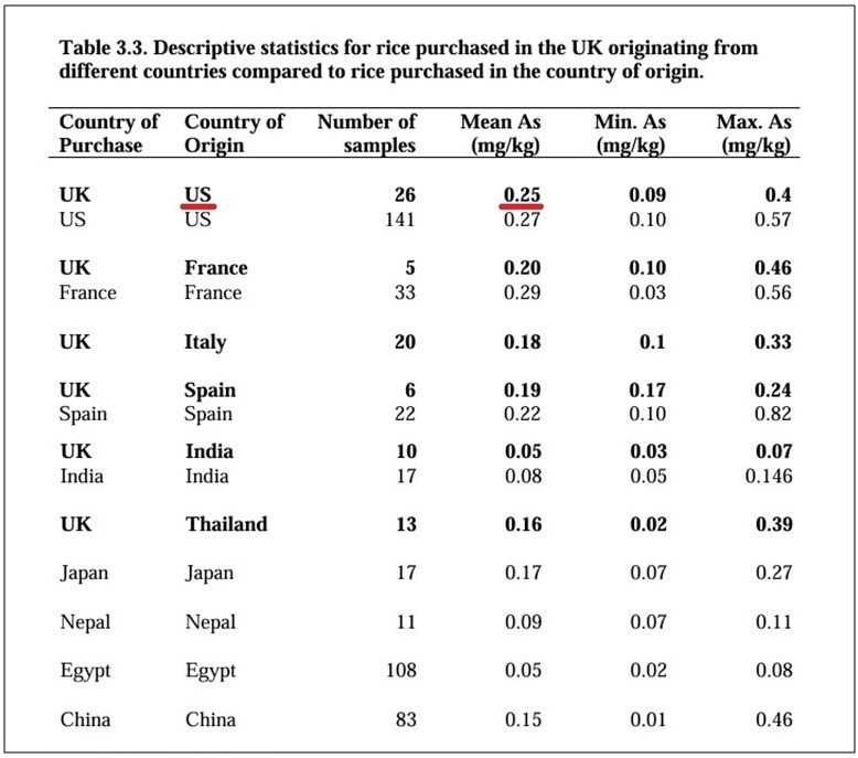 영국에서 조사한 미국 쌀의 비소 평균 함량은 0.25mg/kg 으로, 미국 쌀은 다른 나라 쌀에 비해 일반적으로 더 높은 비소 함량을 보였다 (아래도표) [8] .
