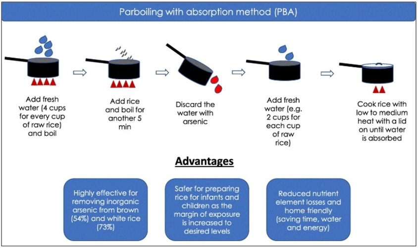 현미 양보다 4배 많은 물을 냄비에 붓고 끓인 후, 현미를 넣고 5분간 더 끓인다. 뜨거워진 이 물은 버린 다음 새 물(현미 양의 2배)을 넣고 밥을 하면 현미 속 무기 비소를 54% 줄일 수 있다(아래 그림) [12].