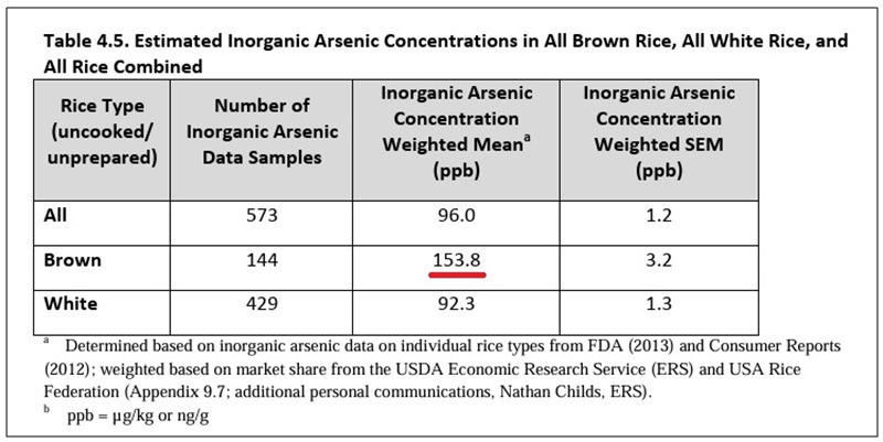 2016년 미국 FDA 발표에 의하면 미국산 현미의 무기 비소 평균 함량은 0.15mg/kg 로 나와 한국산에 비해 약 36.4% 더 높았다 (아래도표) [7].