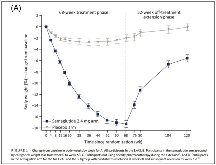 제약사 후원 연구에 의하면, 68주 위고비 사용 후 최대의 체중 감소는 이루어졌으나 약을 끊자마자 바로 체중은 다시 급상승하여 1년 내 이전 체중에 가깝게 회복되는 '요요 현상'이 발생했다 (아래 그래프) [14].