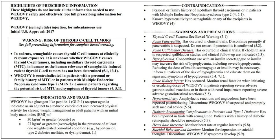 위고비를 만든 Novo Nordisk 회사의 기금에 의한 연구(STEP 1 Trials)에 의하면, BMI 30 이상의 당뇨병 없는 비만환자 또는 BMI 27 이상 과체중으로 1개 이상의 심혈관계 질환을 가진 환자 약 2천명을 68주간 주 1회 사용 후 평균 약 15%의 체중 감소를 얻었다 [11].