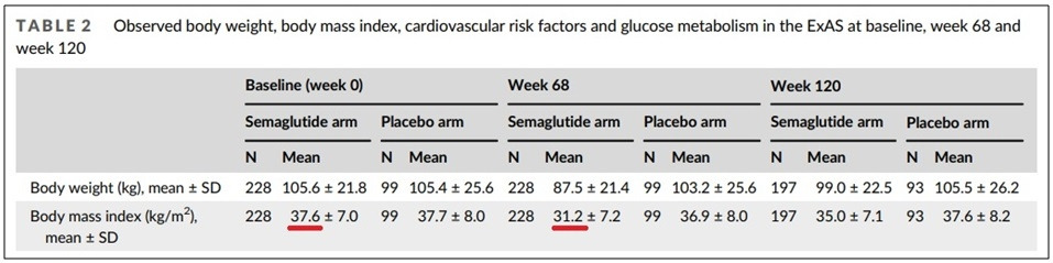 이런 한계로 인해 비만환자가 이 약을 사용해 체중 감량을 하였다 하더라도, 여전히 비만인 경우가 생긴다. 아래 도표와 같이 평균 BMI 37.6인 비만환자들을 68주간 성공적인 투약을 마쳤을 때 평균 BMI는 31.2로 여전히 비만이다. 이 약의 한계인 것이다 [14].