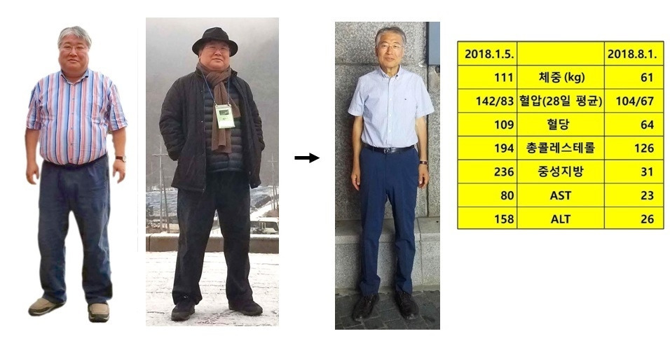 부산대 법학전문대학원 교수님의 경우 채식 7개월 만에 50kg 감량했다. 체중뿐만 아니라 혈압, 혈당, 콜레스테롤, 중성지방, 간수치까지 모두 정상으로 돌아왔다 (아래사진).