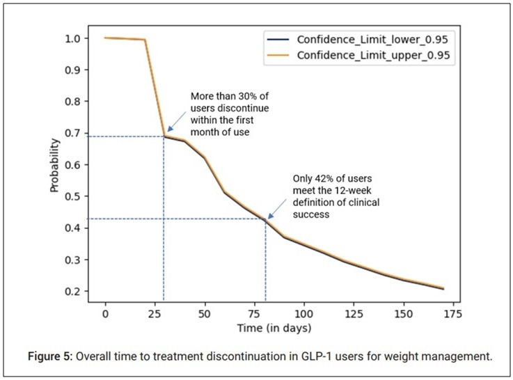 실제 미국인 사용자 약 17만명을 조사한 연구에 의하면, 위고비 사용자의 30%는 1개월 내, 60%는 3개월 내, 80%는 6개월 내, 약 사용을 중지한다 (아래 그래프) [15].