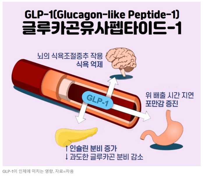 음식물이 위에 들어가면 미주 신경 및 내분비 호르몬의 복잡한 작용에 의해 '소장'에 있는 L-세포에서 'GLP-1(Glucagon like peptide-1)'을 분비한다. 이 호르몬은 식후 15-30분에 혈중 농도가 급속히 상승하여 췌장에서 인슐린 분비를 촉진해 혈당을 낮추고, 위장 속 음식물이 소장으로 넘어가는 위배출 시간을 지연시키고, 뇌에 '포만감' 신호를 보내 식욕을 꺼버림으로써 과식을 방지한다 [2,3,4]. 포만감이 없다면 위장이 상할 정도로 과식할 수도 있기에, 이 작용은 인간의 생존에 매우 중요하다.