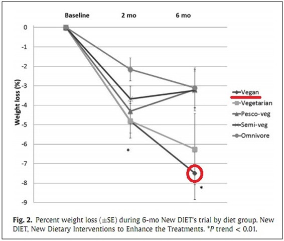 BMI 25 이상의 과체중 성인을 무작위로 5개 그룹(잡식, 세미채식, 페스코, 락토오보, 비건)으로 나누어 6개월간 칼로리 제한을 강제하지 않고(패스트푸드와 가공식품 제한, 저지방 저당지수 식품 권장) 체중변화를 관찰한 결과, 완전 채식인 비건 그룹에서 가장 많은 체중 감소(평균 -7.5%)가 일어났다 (아래그래프)[45].