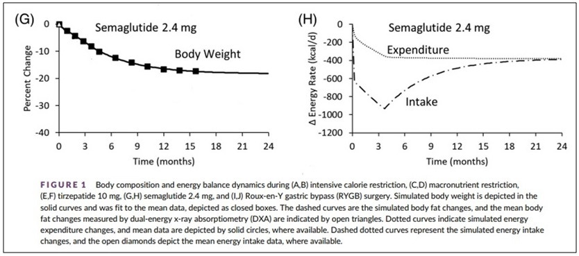 약물로 식욕을 제한하는 것은 한계가 있다. 우리 몸은 약에 의한 강제적인 식욕 감소에 에너지 소비를 줄이는 등으로 적응하다, 3-4개월 뒤엔 '생존 본능'에 의해 다시 식욕이 살아나고 12개월쯤 되면 한계에 봉착해 인위적인 체중 감소에 저항한다 (*아래 그래프 설명 -> (G) 위고비 사용 1년쯤 되면 더 이상 체중은 줄지 않는다. (H) 약 사용 후 음식 섭취량이 감소하다 3-4개월 지나면 다시 섭취량이 점점 증가한다.) [12].