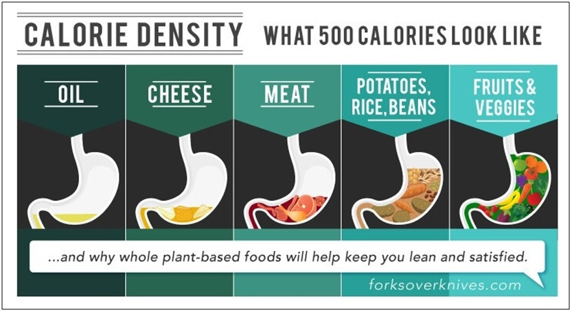 여러 가지 기전이 있지만 그중 가장 중요한 것은 칼로리 밀도(Calorie density, 식품 단위 부피당 가진 칼로리)라는 개념이다.