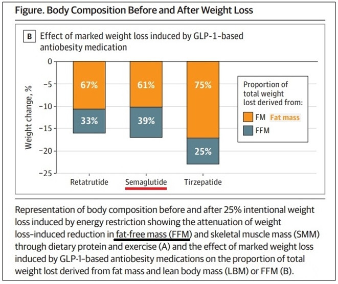 우리가 보통 "살을 뺀다"라고 하면 지방을 없애는 걸로 이해하지만, 약물에 의한 체중 감량인 경우 지방만 빠지는 게 아니라 근육도 같이 빠진다. 위고비에 의한 체중 감량 시 빠진 체중의 약 40%는 지방이 아닌 조직(fat-free mass)으로 이 중 절반은 순수 근육이다. 즉 총 5kg의 체중 감량이 되었다면, 이중 1kg은 근육이란 뜻이다 (아래 도표) [26].