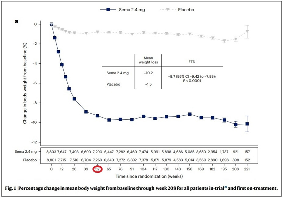 최근(2024년) 네이쳐(Nature)에 발표된 위고비 4년 연구에 의하면, 약의 효과는 1년이 지나면 없어지고, 더 이상 약을 써도 체중 감소는 되지 않는다. 그 이후엔 감소된 체중을 유지할 뿐이다 (아래그래프) [13].