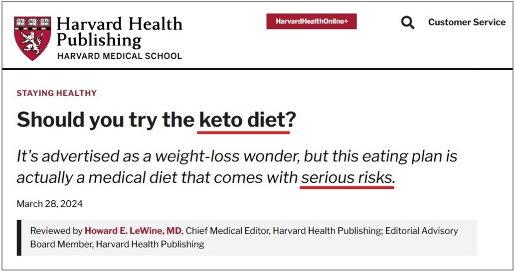 현재 미국에서도 키토제닉 다이어트는 사회적으로 심각한 건강 문제로 부각되어, 최근 하버드 대학 건강 소식지에서 "키토 다이어트는 소아의 악성 간질에 사용되는 의학적 치료법으로 살 빼는데 쓰면 안된다. 왜냐면 여러가지 심각한 부작용이 생겨 지속할 수도 없고, 중단 시 체중이 금방 다시 돌아오기 때문이다."라고 경고했다 (아래 기사) [44].