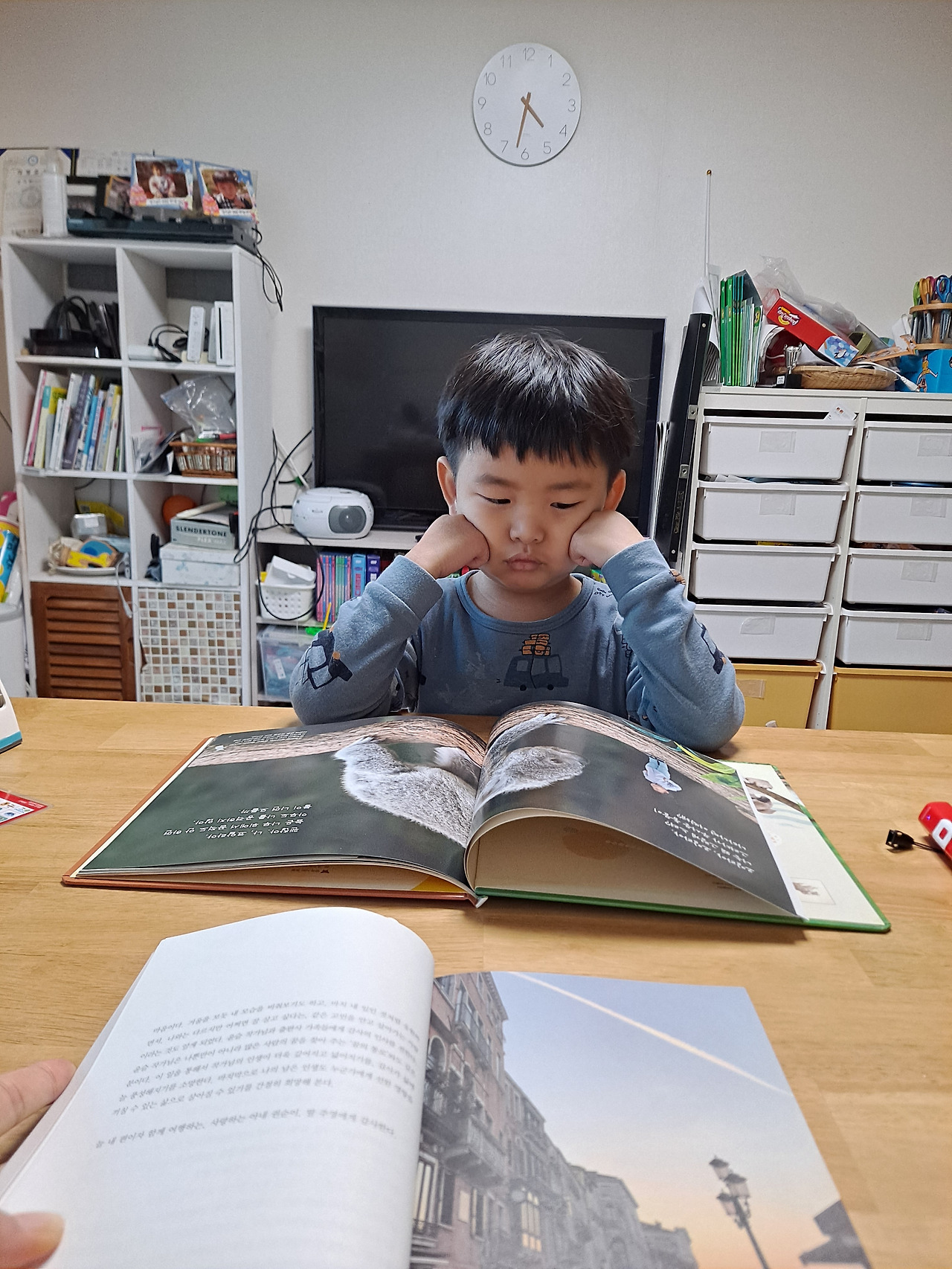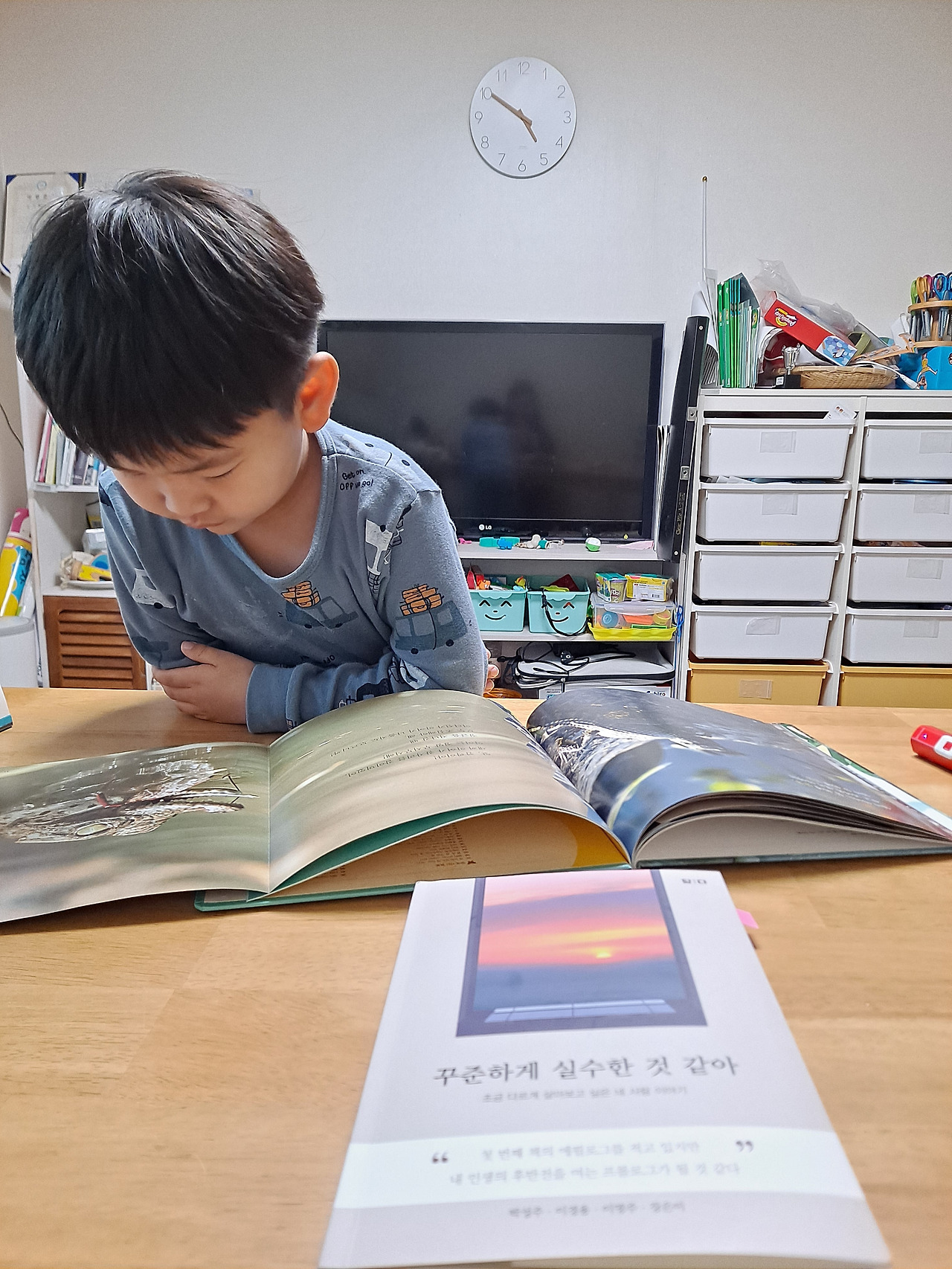 엄마가 김밥 쌀 동안 아빠랑 아이는 보드게임을 했어요.