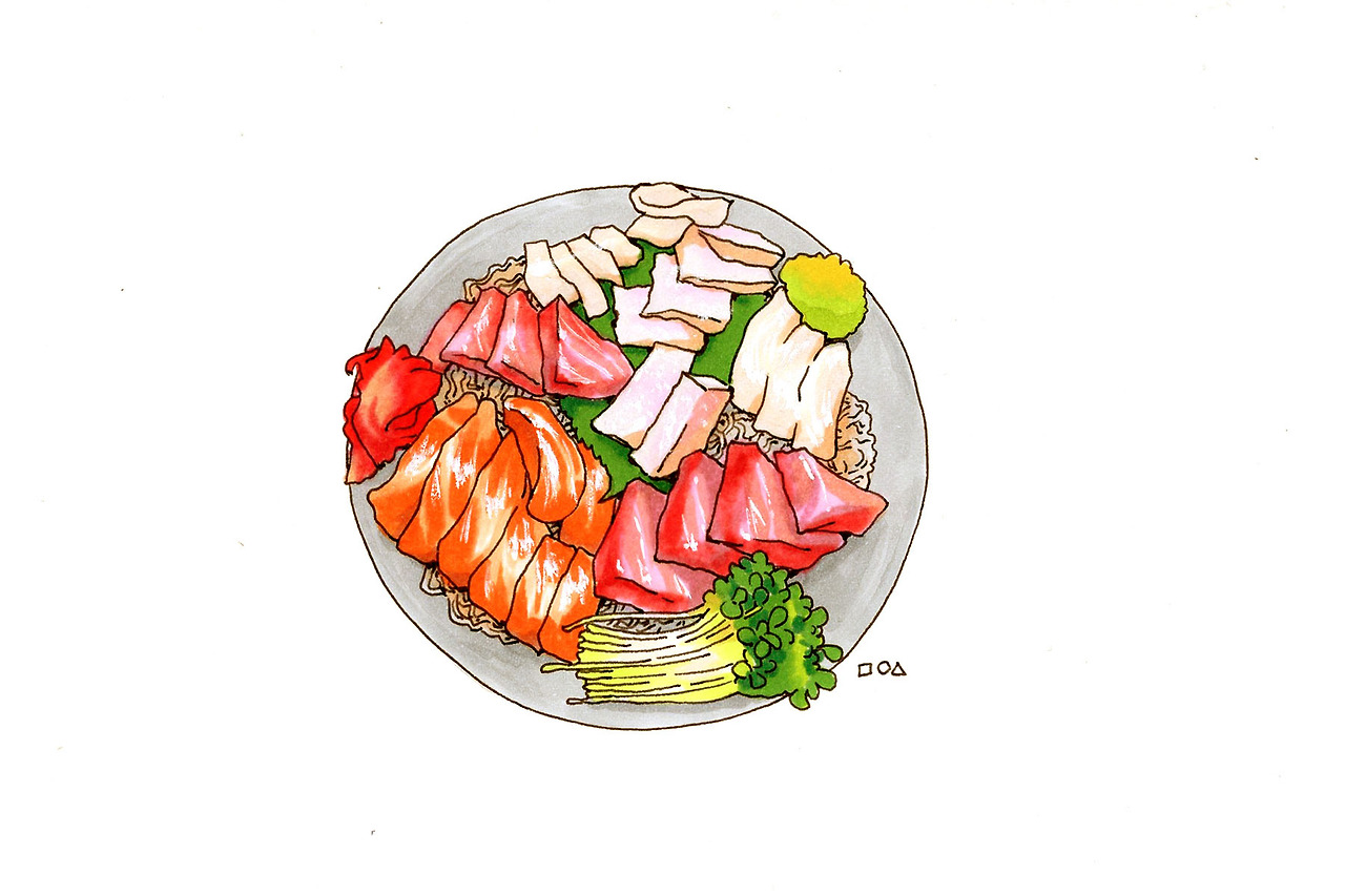 가게는 다소 작은 느낌을 주는 외관으로, 목재 프레임과 유리로 벽을 이루고 있고 간판부와 캐노피는 흑갈색 톤으로 이루어져 있다. 반주 겸해서 찾아오는 곳이라 몰랐는데, 점심시간에도 덮밥류 등으로 영업을 하는 것으로 보인다. 자리는 다찌와 2인용 작은 테이블 3자리 정도의 소규모로 되어 있다. 먼저 온 손님들이 테이블은 이미 자리를 차지하고 있어 안쪽의 다찌자리로 앉았다. 모둠회를 주문해본다. 벽면에 친절하게 참치, 광어, 생연어, 대방어 등의 메뉴 구성 안내와 간단한 설명과 함께 프린트되어 붙어 있다.
