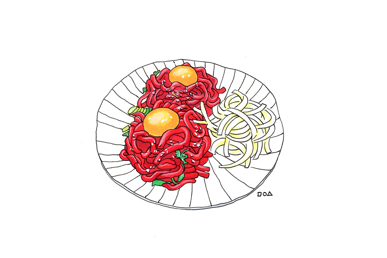 식사보다는 시원한 술안주를 먹고 싶었던 날이라 육회를 주문하였다. 기본 메뉴로는 늘 그렇듯이 부추와 단무지가 나온다. 배가 고플 때는 이런 단무지도 맛있다. 다른 곳의 단무지가 다르게 꼬들한 식감이다. 한 잔의 맥주가 먼저 나오고, 육회 두 덩이가 담긴 접시가 나온다. 고기 위에는 생계란과 양파 등이 같이 얹어져 있다. 한 덩이 마다, 소스가 달라 2가지의 맛의 육회를 먹는 듯하다. 맥주와 궁합도 의외로 괜찮고, 가격을 생각하면 가성비가 정말 좋다는 생각이다. 이어서 새우튀김과 샐러드를 먹게 되었다. 크기가 크진 않지만, 10마리가 넘는 것 같다. 짭쪼롬하면서 바삭한 식감과 샐러드는 술을 부른다.