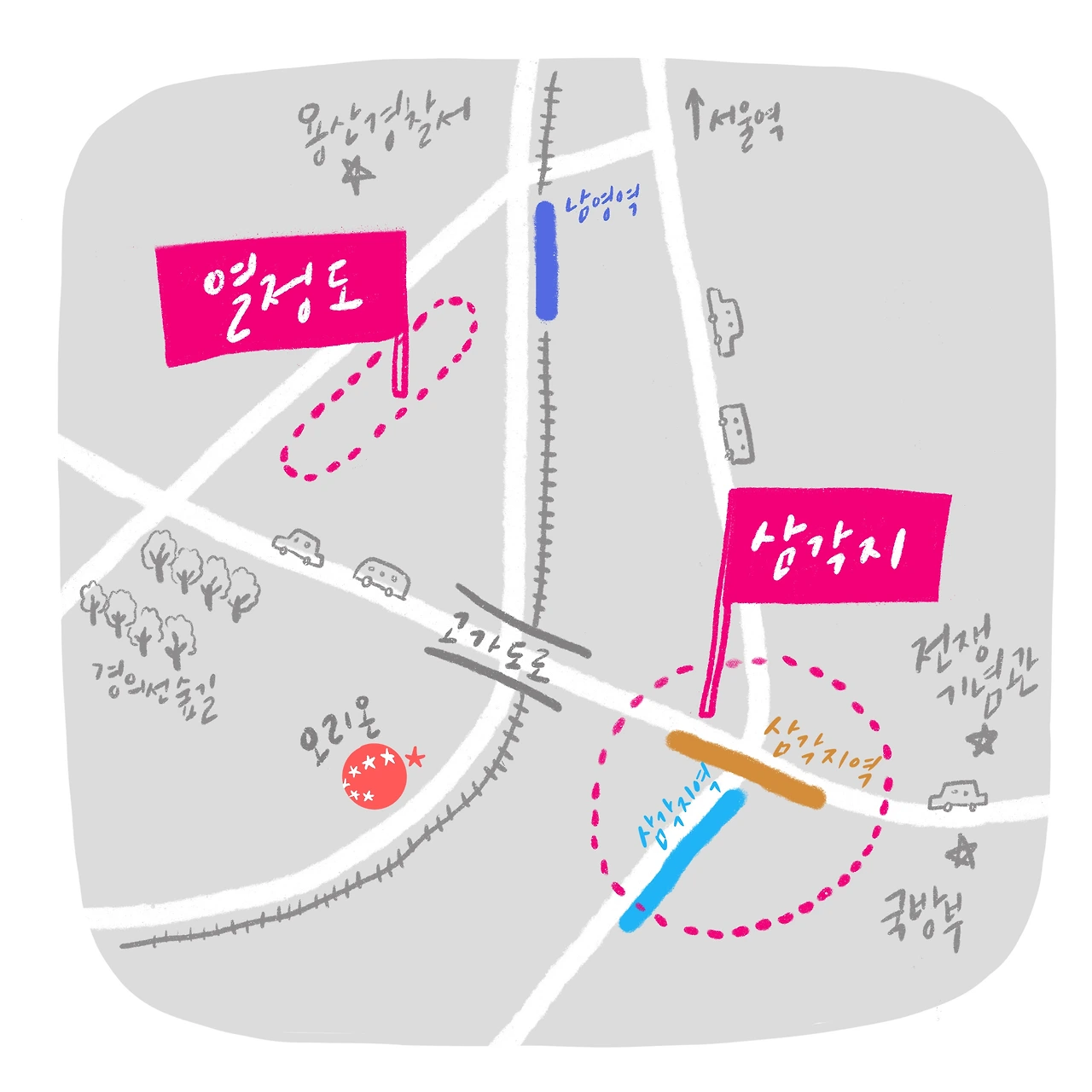 오랜만에 삼각지 지도를 다시 그려보았어요. 항상 마음의 고향같은 곳이에요 :-)