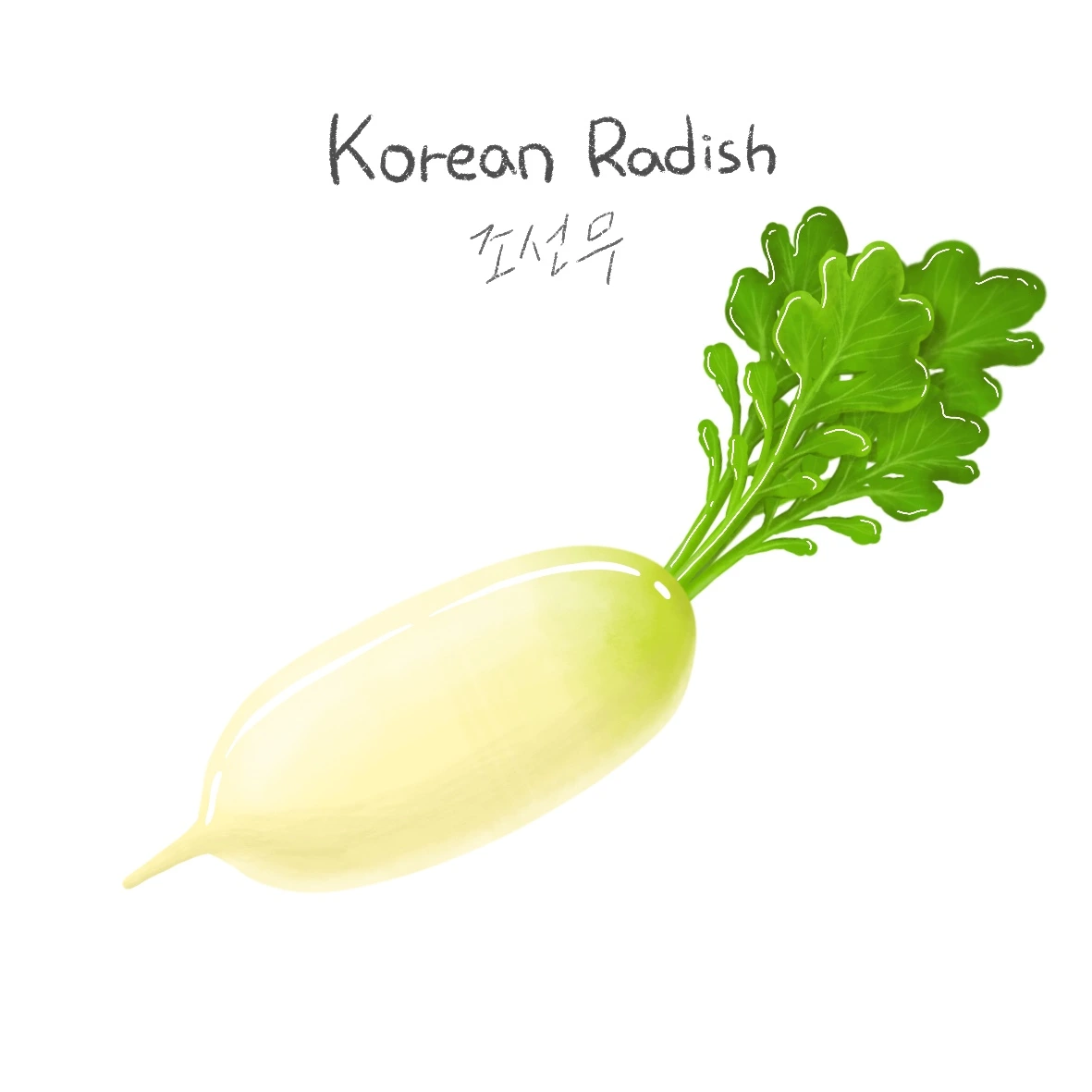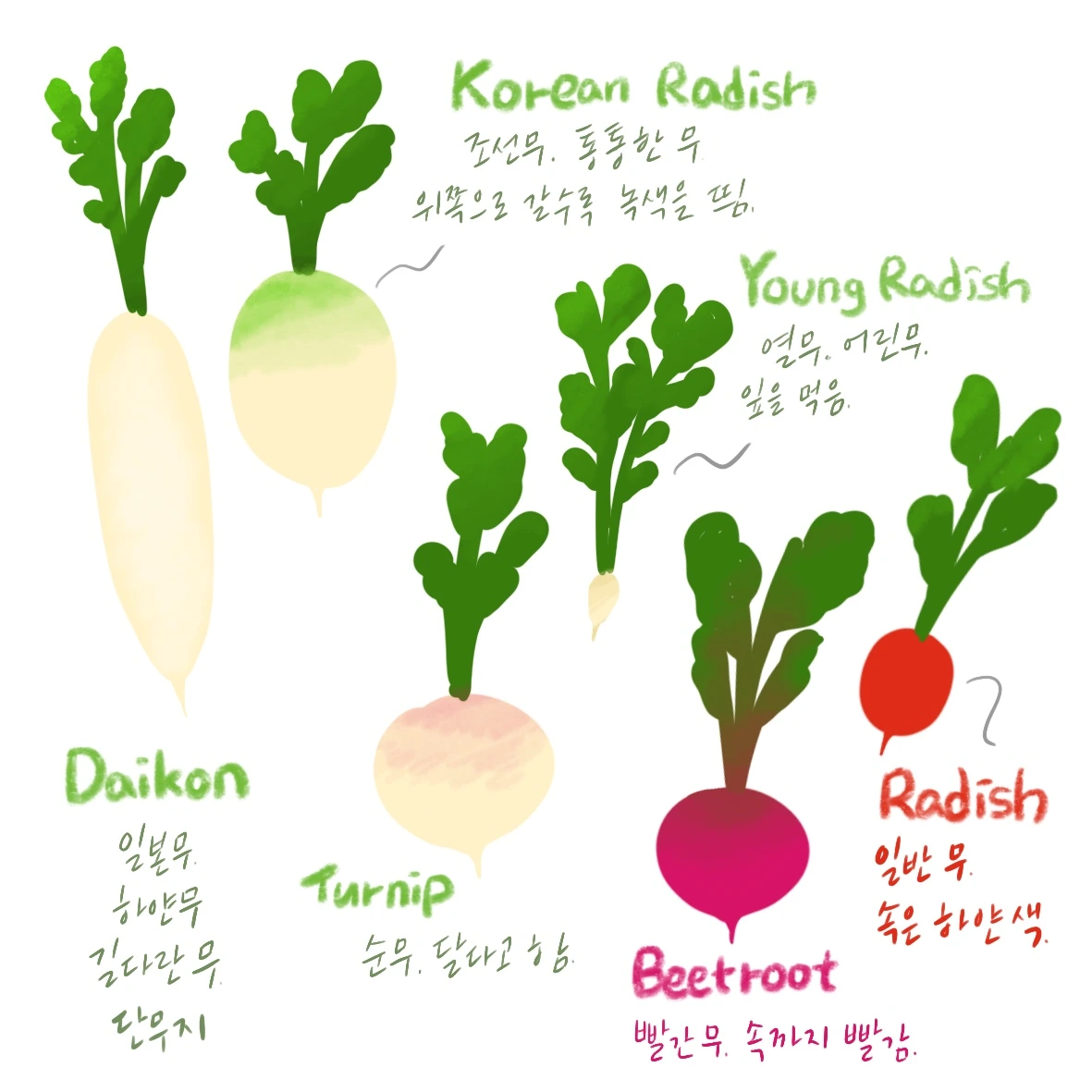 Radish가 일반적으로 무를 부르는 단어이기도 한 것 같고, 동양과 달리 서양에서는 빨갛고 동그란 형태의 무가 일반적인 모양인 것 같아요.
