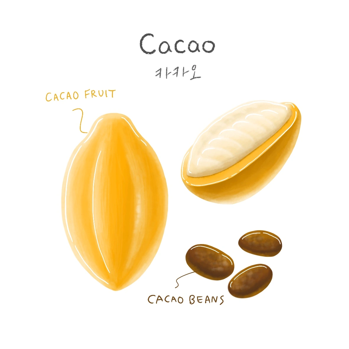 카카오 열매는 노란색, 녹색, 붉은색 등을 띄고 있어요. 길다랗게 생긴 카카오 열매를 쪼개면 하얀 과육이 드러나는데요, 이 과육이 카카오 빈을 감싸고 있다고 해요. 빈을 분리하여 며칠간 발효시키면 우리가 아는 카카오 향이 난다고 하는군요.