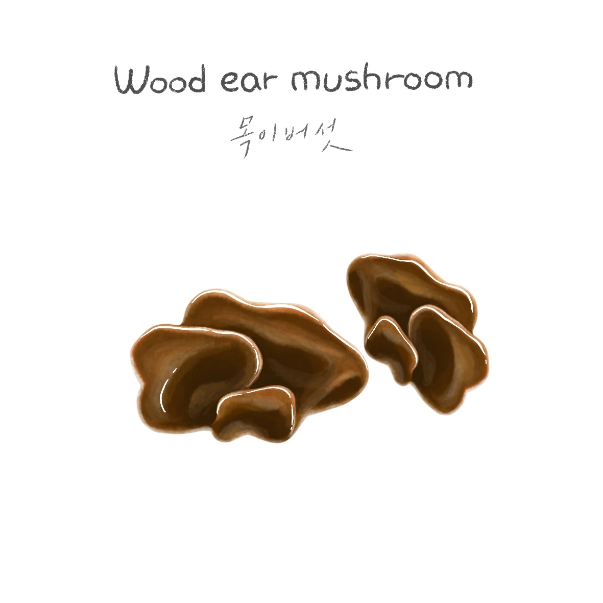 이름에 대해서는 한번도 생각해본 적이 없었는데, 이번 기회에 찾아보니 木耳 (나무 목, 귀 이)라고 쓰네요. 흡사 사람의 귀 모양과 비슷하다고 하여 붙여진 이름이라고 하는데요, 버섯이 주로 나무에서 자라기 때문에 나무 의미가 더해진 것 같아요. 영어이름도 이와 같은 의미로 Wood ear mushroom이라고 쓰는 것이 참 재미있어요 :-)