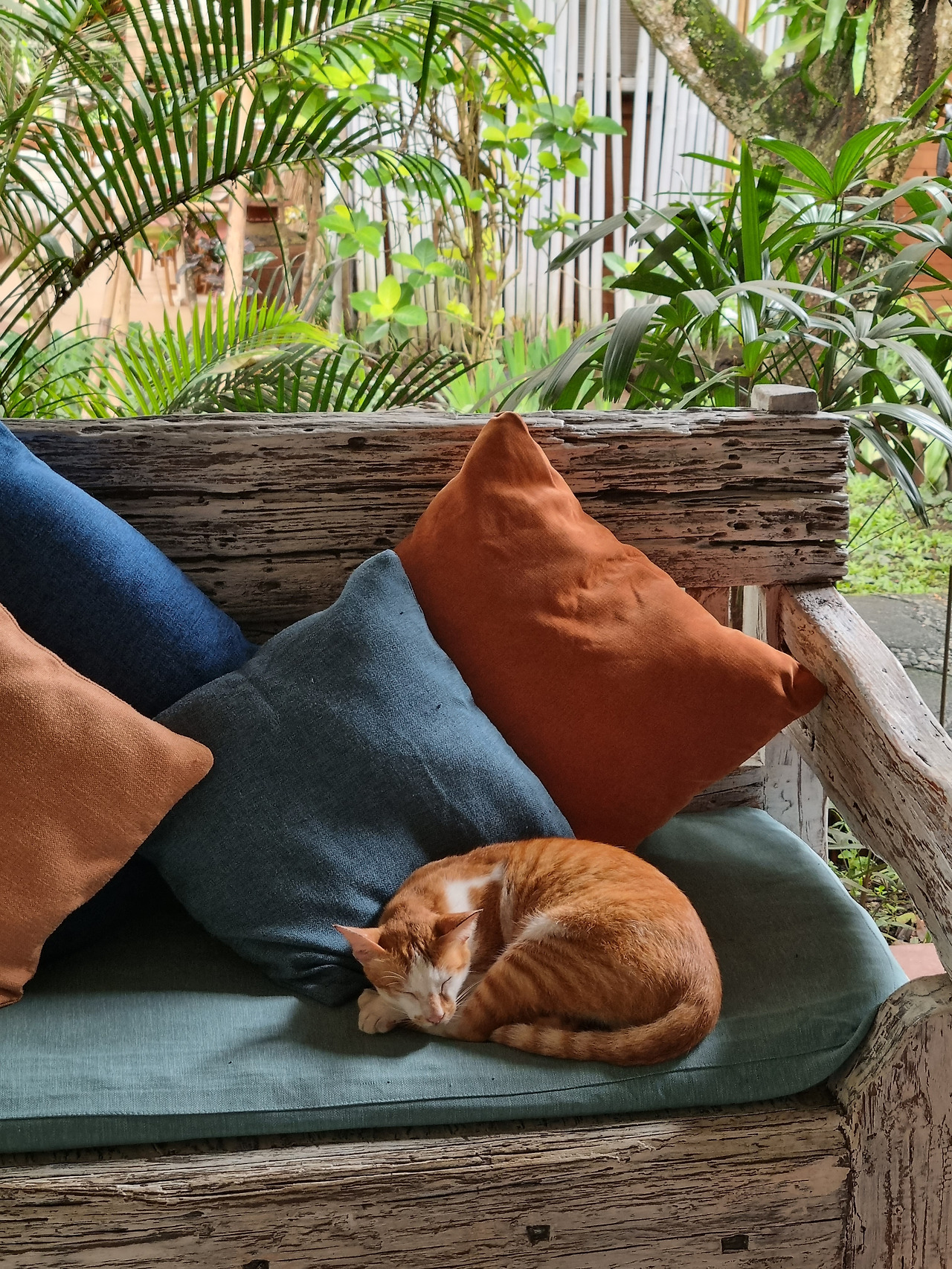 리셉션에 도착을 하니 포근한 소파와 그 위에서 평화롭게 자고 있는 주황색 털의 고양이가 있었다. 우붓에 오기 전 스미냑을 들렸었는데 거기 고양이들은 다들 너무 말라서 마음이 안 좋았었다.