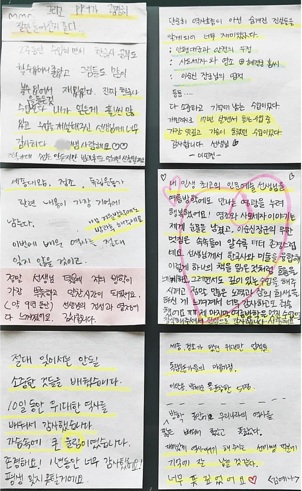 1년 간의 미술 수업이 끝나던 날, 아이들이 써주었던 미술수업에 대한 선물 같은 롤링페이퍼