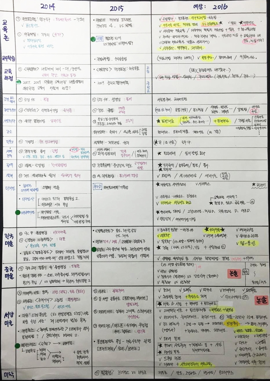 나는 디자인 전공이었기 때문에 동서양 미술사를 배우거나 공부해 본 적이 없었다. 디자인사도 단편적으로 접해 임용시험에서 다루는 내용들에 대한 지식이 거의 없는 상태였다. 교육대학원에서도 미술교육의 방법론과 교수학습 평가, 미학 비평에 대한 수업이 대부분이었기 때문에 임용시험 공부에는 실질적 도움이 되지 않는 학업이었다. 겨우 그 정도 수준으로 미술을 좋아하기만 했던 일반인 나는 겁도 없이 미술교사가 되겠다고 결심했다.