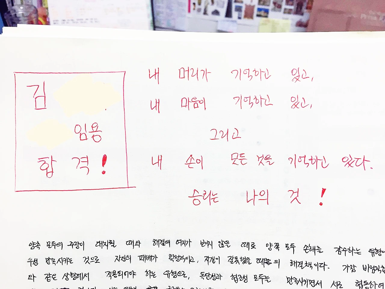 아침 10시부터 오후 3시까지 병석에 누워계신 엄마를 매일 간호하며 녹초가 된 상태로 졸음을 겨우 이기며 공부했다는 글이었다. 그때 든 생각은 '이렇게 몇 시간 공부하지 않아도 합격할 수가 있구나! 나 같은 사람도 합격할 수 있겠다!'였다.