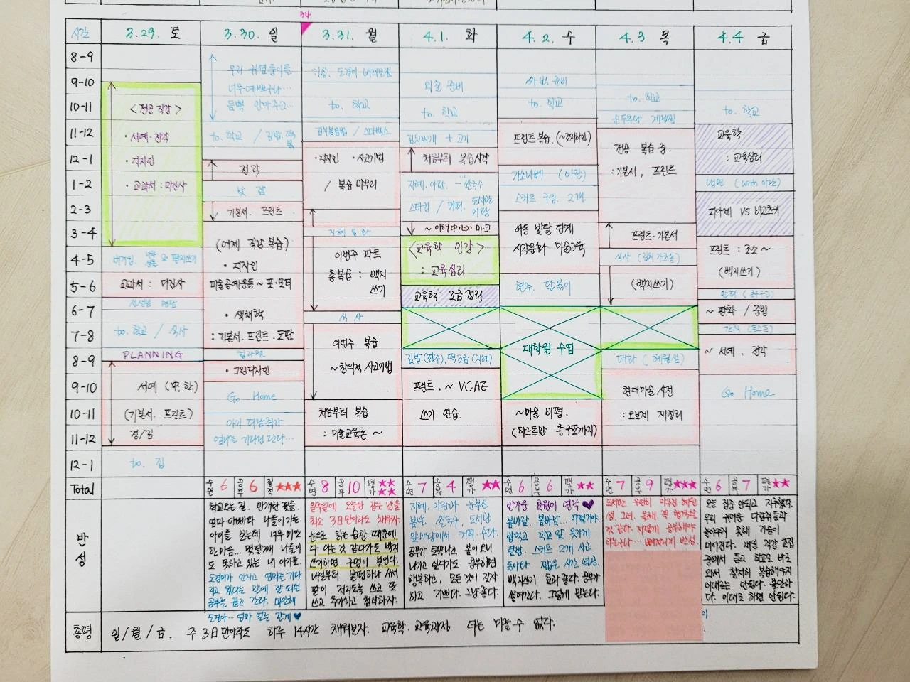 <학습 계획표> 나에게 맞는 양식을 만들어서 출력해 썼다. A4 한 페이지는 1주일 분량이고 한 시간 단위로 쪼개서 계획하고 실천했다.