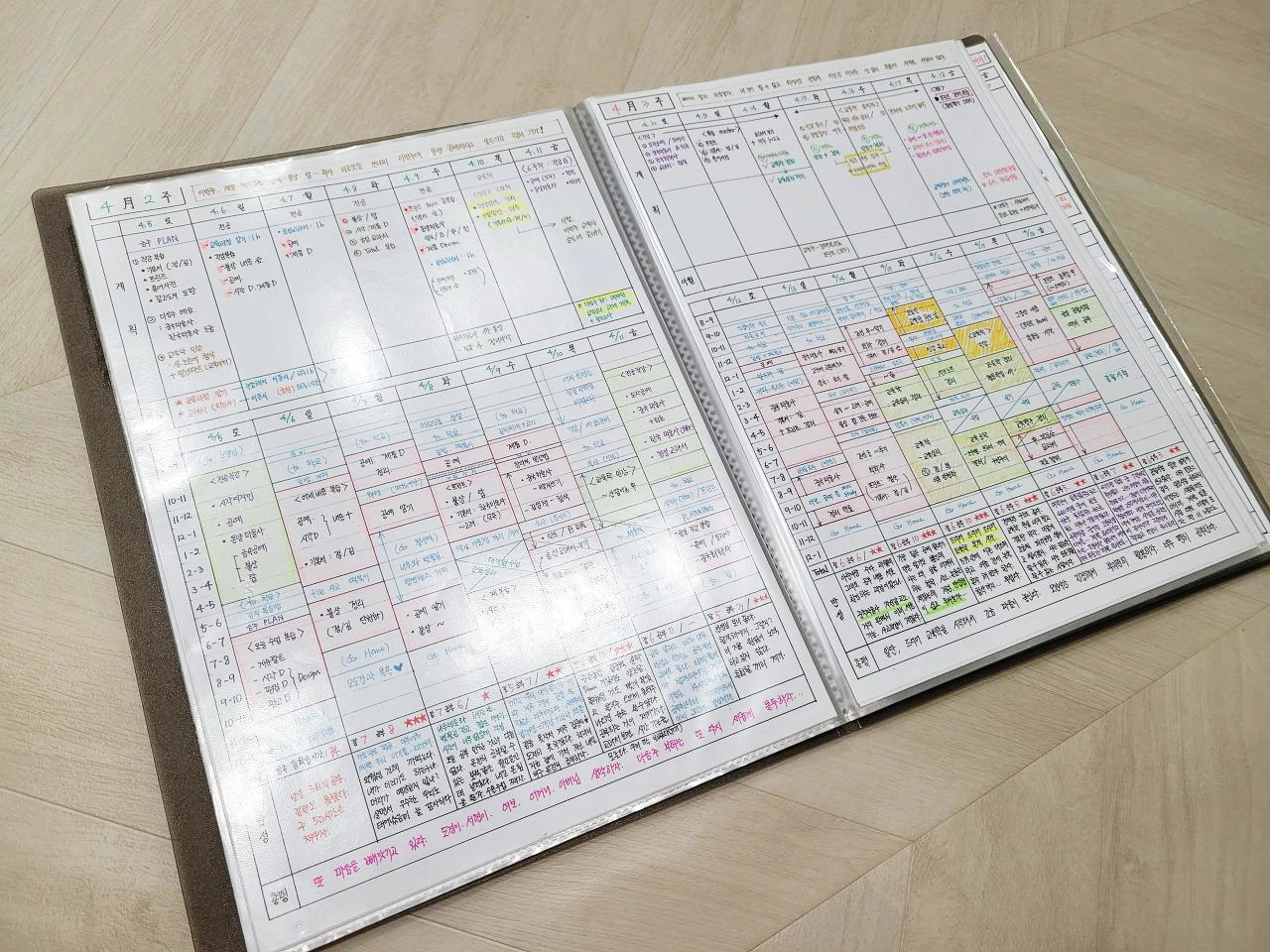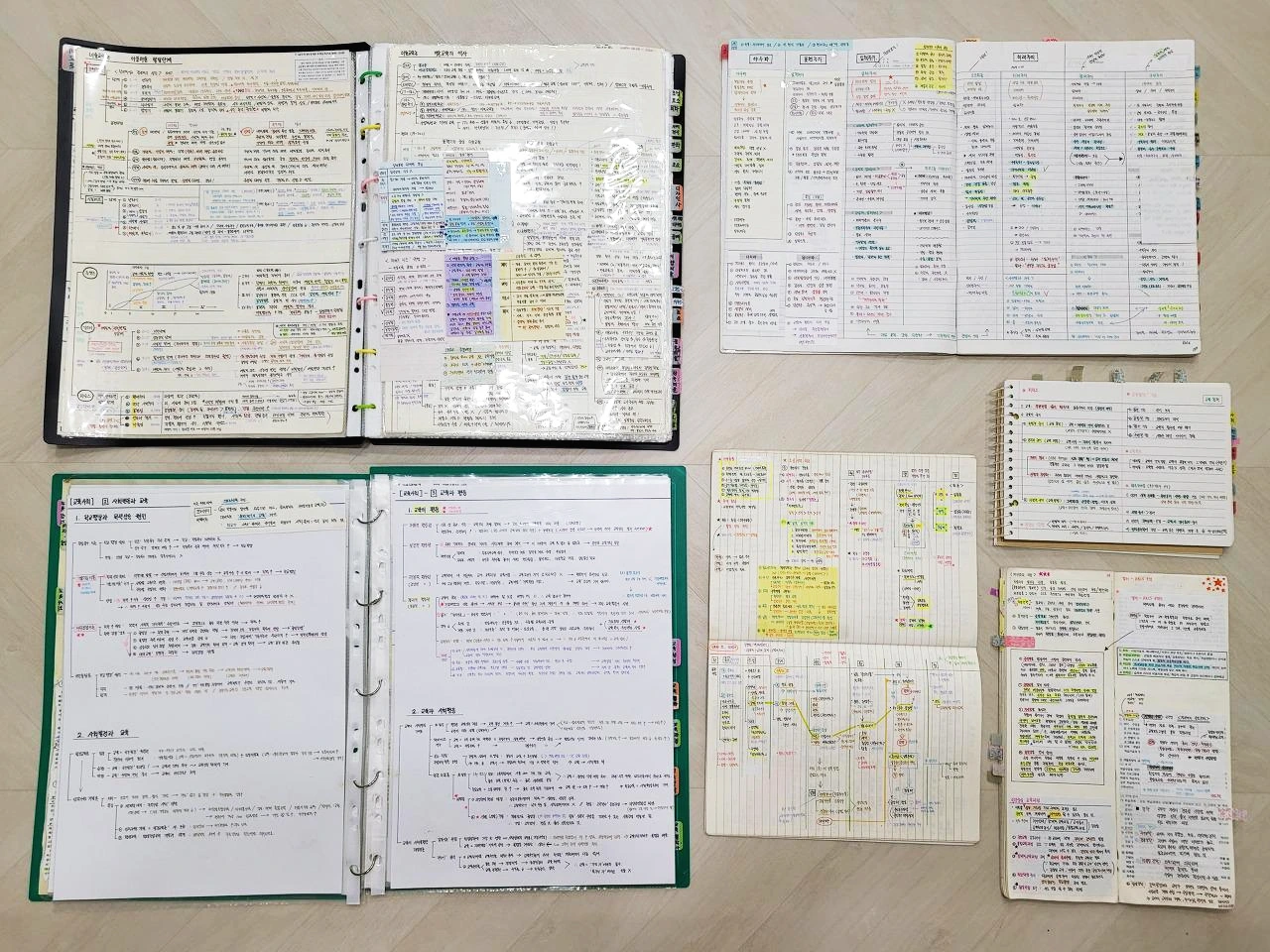 주간 학습 계획표와 요약정리한 여러 권의 내 노트들