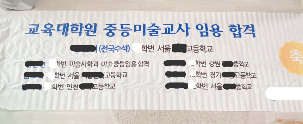 미술교육대학원에 걸린 합격자 플래카드. 10년을 공부하고 합격한 선생님도 있었다. 우리 지도 교수님이 이 플래카드를 손수 챙겨 간직하라며 나에게 직접 주셨다.