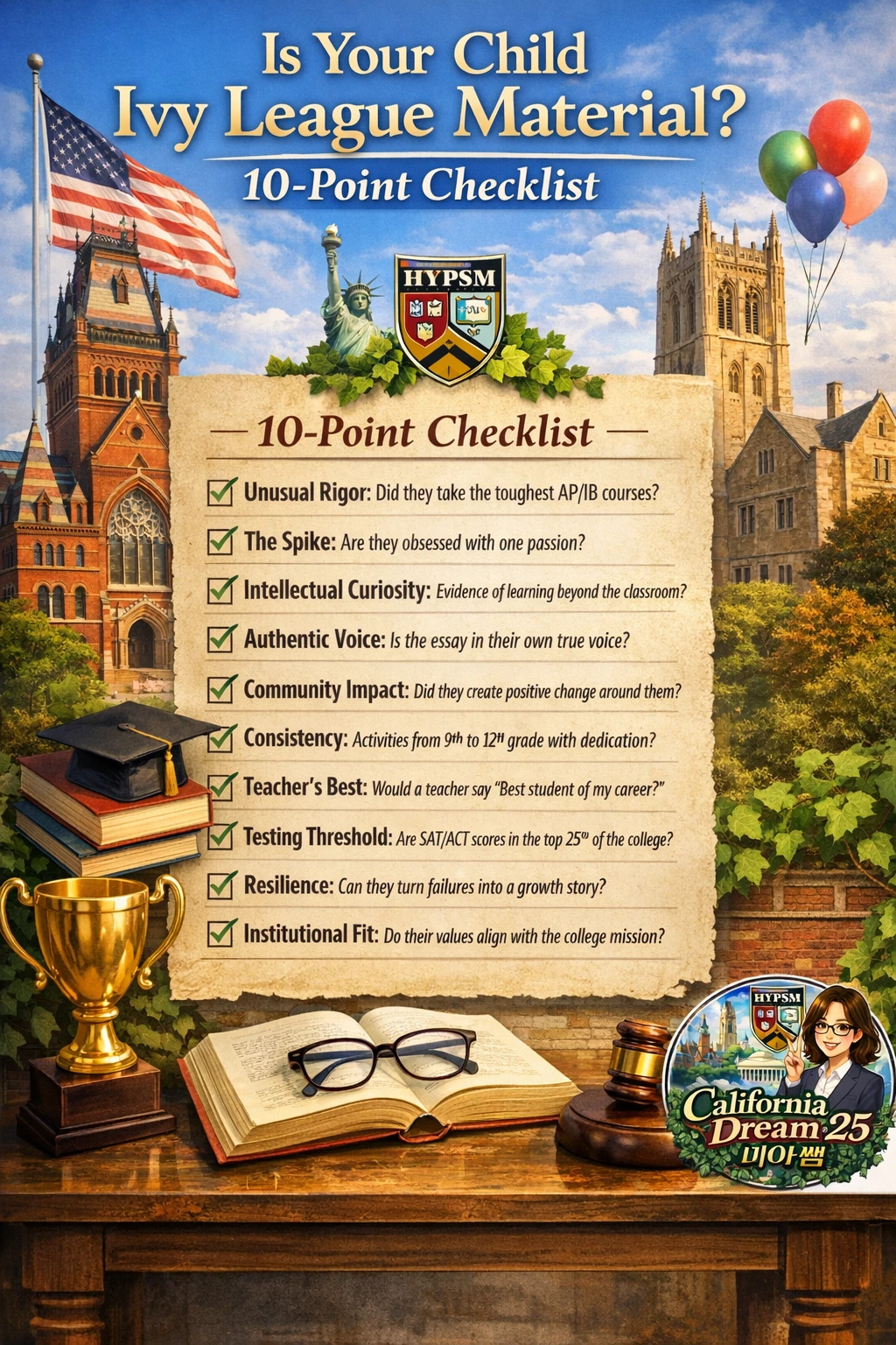 웃음기 빼고 답하자면, 그렇다. 합격하는 아이들에겐 분명한 ‘상’이 있다. 그것은 이목구비의 생김새가 아니라, 원서 전체에서 뿜어져 나오는 ‘기운’의 문제다. 내 아이가 과연 아이비리그 사정관의 손가락을 멈추게 할 ‘합격상’인지, 아래의 10가지 지표로 냉정하게 점검해 볼 필요가 있다.