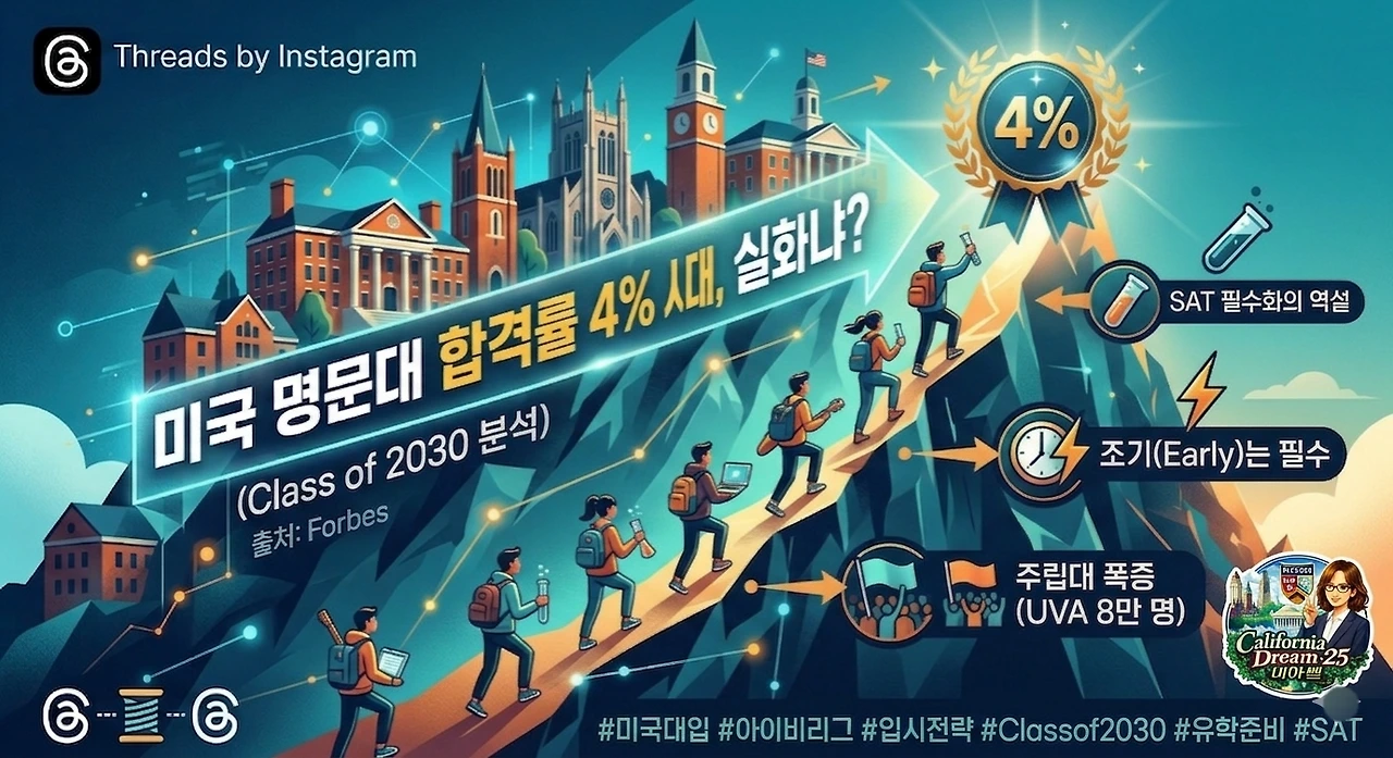 2026년 3월 27일, Forbes를 비롯한 주요 외신을 통해 Class of 2030의 합격 통지서가 발송되었다. 매년 "역대 최악의 입시"라는 말이 관용구처럼 쓰이지만, 올해 수치는 그 궤를 달리한다. 이제 미국 명문대 입시는 단순히 '공부 잘하는 아이'를 뽑는 과정을 넘어섰다. 4%라는 바늘구멍을 뚫기 위해 우리가 직시해야 할 불편한 진실들을 정리했다.