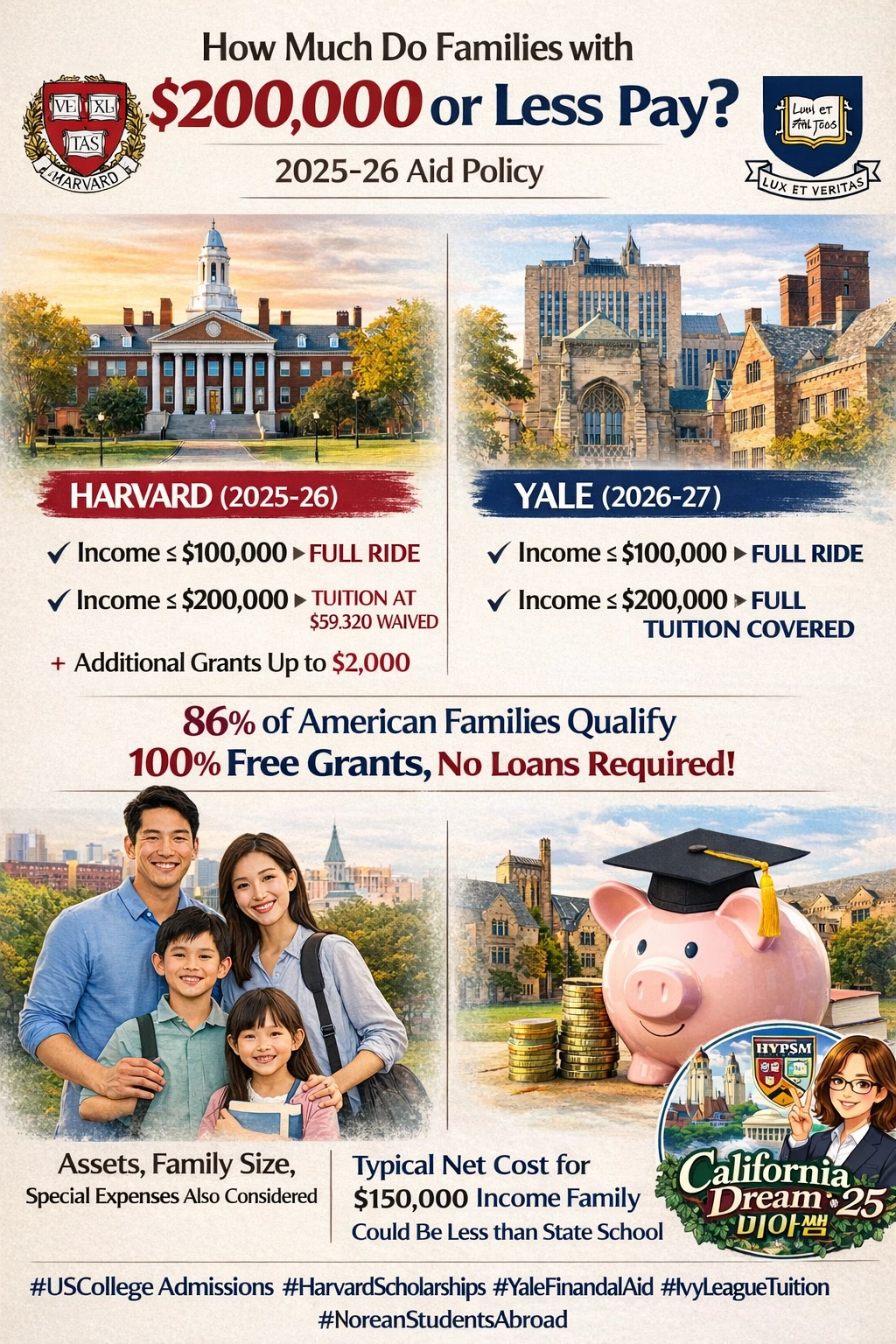 미국 탑스쿨을 꿈꾸는 이민 가정의 부모들이 가장 먼저 하는 계산이 있다. 하버드 연간 학비 $86,926. 예일은 $90,550. 숫자를 보는 순간 많은 부모들이 속으로 포기한다. 우리 집 수입으로는 무리라고. 그런데 그 계산이 틀렸다. 2025년과 2026년, 하버드와 예일이 연달아 발표한 재정지원 정책의 내용을 제대로 알고 나면 이야기가 완전히 달라진다.