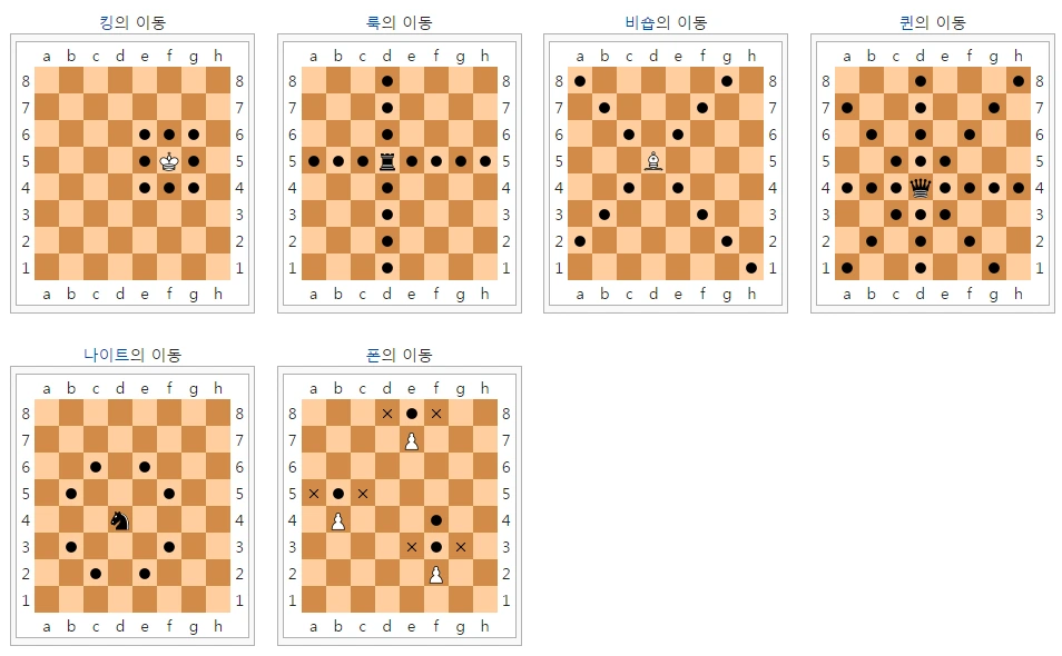 체스 피스에는 위 사진에서 볼 수 있듯이 총 6가지 종류가 있습니다. 왼쪽부터 킹, 퀸, 비숍, 나이트, 룩, 그리고 폰이라고 부릅니다. 먼저 "킹, " 즉 왕은, 아까 말했듯이 게임에서 가장 핵심적인 말입니다. 내 편의 "킹" 이 잡혀버리면, 체크메이트라고 해서 그 게임을 지게 되니까요. 킹은 앞, 옆, 뒤, 대각선 어느 방향이든 한 칸을 전진할 수 있습니다. 퀸은 왕비를 뜻하는 피스로, 체스 게임 중 가장 강력한 피스입니다. 원하는 어느 방향이든 칸에 제약 없이 진격할 수 있습니다. 퀸이 이렇게 강력한 파워를 지니게 된 것은 15세기부터인데요, 워낙 강력한 피스이다 보니 현대 체스는 "퀸스 체스 (Queen's chess)" 또는 "미친 여왕의 체스" 로도 불린답니다. 비숍은 주교를 뜻하는 피스로, 대각선 방향으로 원하는 칸만큼 전진할 수 있습니다. 나이트는 기사를 뜻하는 피스로, 중세 기사들이 말을 타고 다닌 것을 표시하기 위해 말 머리 모양을 하고 있으며, L자 모양으로 수직/수평으로 두 칸 간 후 대각선 방향 (오른쪽 대각선이든 왼쪽 대각선이든 상관없이) 한 칸을 갈 수 있습니다. 룩은 성을 뜻하는 피스로, 성 모양을 하고 있지요. 룩은 수직 혹은 수평 방향으로 원하는 칸 수 만큼 갈 수 있습니다. 마지막으로, 폰은 장기의 졸(卒)과 같은 피스로, 처음 시작할 때는 두 칸 혹은 한 칸, 그 이후에는 기본적으로 앞으로 한 칸 씩만 움직일 수 있습니다. 하지만 만약 대각선 한 칸 앞에 적의 피스가 놓여 있다면, 그 피스를 잡기 위해서 대각선으로 한 칸 움직이는 게 허용되지요.